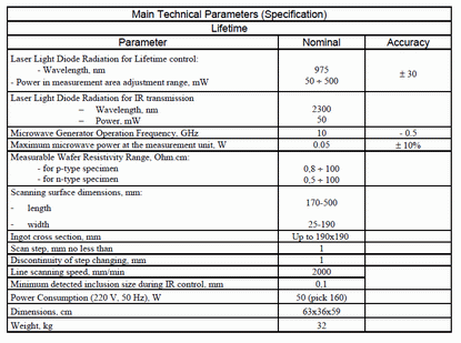 We are honored to offer contactless lifetime measuring and mapping device for non equilibrium carrier lifetime inspection at silicon mono and multicrystalline ingots with simultaneous IR scanning of cracks and inclusions detection.