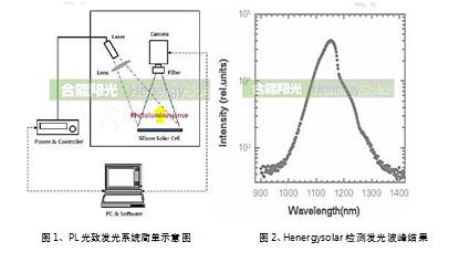 圖1是PL檢測系統(tǒng)的簡單示意圖,圖2是合能陽光公司的對晶體硅PL發(fā)光波峰檢測的結(jié)果,與理論一致,并且信號很強(qiáng)。