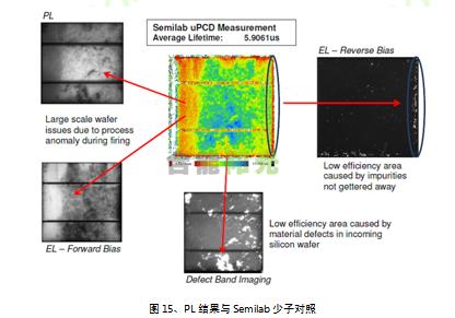 通過PL系統(tǒng)分析,可精確定位到diffusion這一步有問題,diffusion厚度不均,滾輪damage等;后續(xù)的工藝乃至最后的電池片結(jié)果說明,厚度不均的問題在之后的環(huán)節(jié)對wafer進(jìn)行了優(yōu)化,最后不會明顯減低cell效率,而滾輪的damage影響到之后所有的環(huán)節(jié),并最終影響到cell效率。
