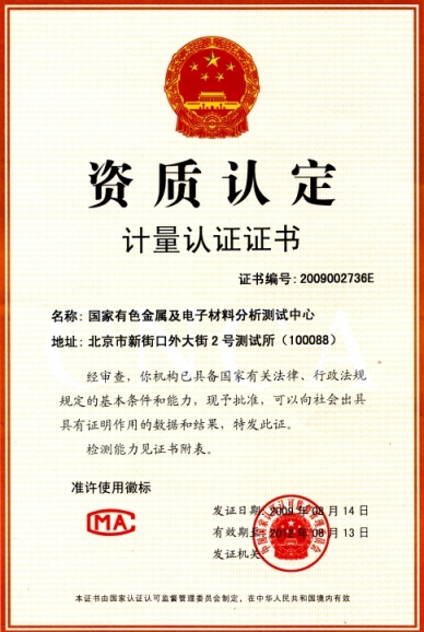 國家級資質(zhì)認(rèn)定計(jì)量認(rèn)證證書,CMA 2009002736E;
