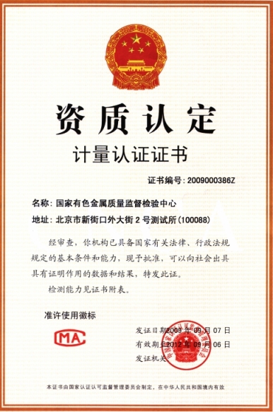 國家級資質(zhì)認(rèn)定計(jì)量認(rèn)證證書,CMA 2009000386Z;
