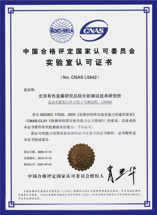 國家有色金屬及電子材料分析測試中心是一九八三年六月經(jīng)原國家科委批準(zhǔn)成立的第一個(gè)國家級分析測試機(jī)構(gòu),建設(shè)在北京有色金屬研究總院,業(yè)務(wù)上受國家科學(xué)技術(shù)部指導(dǎo)。1992年通過計(jì)量認(rèn)證,2001年通過實(shí)驗(yàn)室國家認(rèn)可。