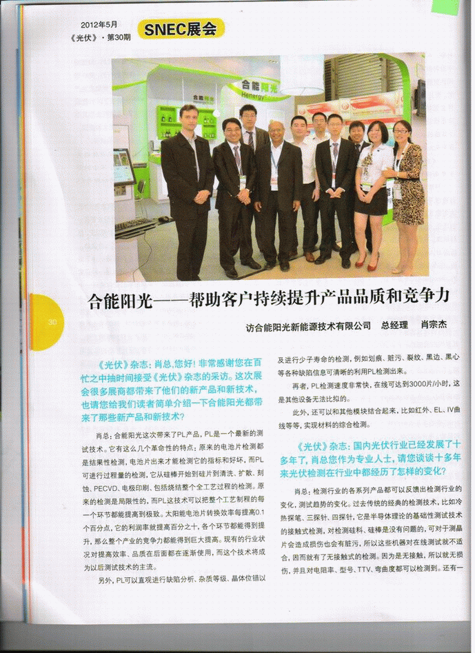 肖總:合能陽(yáng)光這次帶來(lái)了PL產(chǎn)品,PL是一個(gè)最新的測(cè)試技術(shù)。它有這么幾個(gè)革命性的特點(diǎn):原來(lái)的電池片檢測(cè)都是結(jié)果性檢測(cè),電池片出來(lái)才能檢測(cè)它的指標(biāo)和好壞,而PL可進(jìn)行過(guò)程量的檢測(cè),它從硅棒開(kāi)始到硅片到清洗、擴(kuò)散、刻蝕、PECVD、電極印刷、包括燒結(jié)整個(gè)全工藝過(guò)程的檢測(cè)。原來(lái)的檢測(cè)是局限性的,而PL這技術(shù)可以把整個(gè)工藝制程的每一個(gè)環(huán)節(jié)都能提高到極致。太陽(yáng)能電池片轉(zhuǎn)換效率每提高0.1個(gè)百分點(diǎn),它的利潤(rùn)率就提高百分之十,各個(gè)環(huán)節(jié)都能得到提升,那么整個(gè)產(chǎn)業(yè)的競(jìng)爭(zhēng)力都能得到巨大提高。現(xiàn)有的行業(yè)狀況對(duì)提高效率、品質(zhì)在后面都在逐漸使用,而這個(gè)技術(shù)將成為以后測(cè)試技術(shù)的主流。